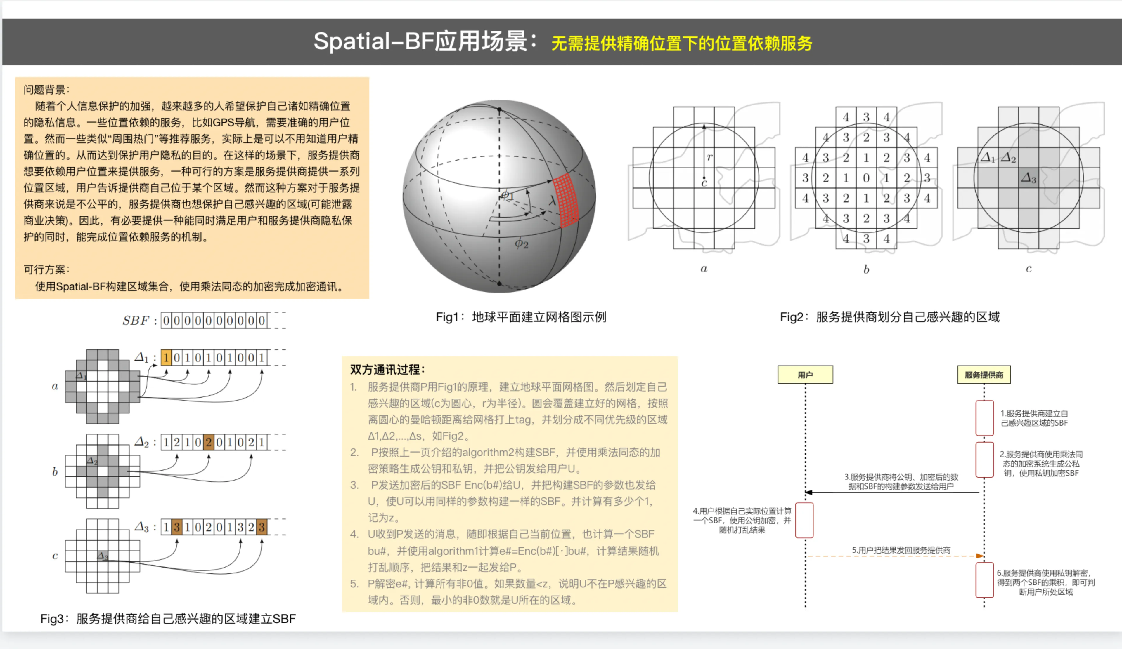 作为论文中的例子,作者利用SBF建模地理信息,使用同态加密保证数据的“可用而不可见”,来完成对通讯双方位置隐私的保护。从而构建了一种无需提供精确位置下的位置依赖服务(location base service)。由于通讯流程比较复杂,这里就不展开讲解了。