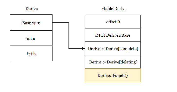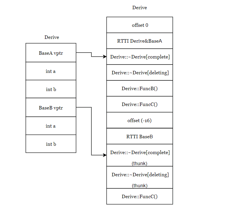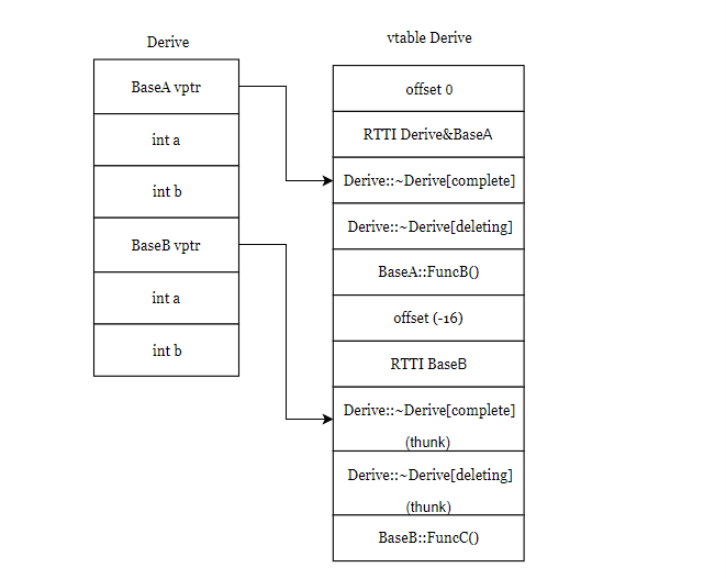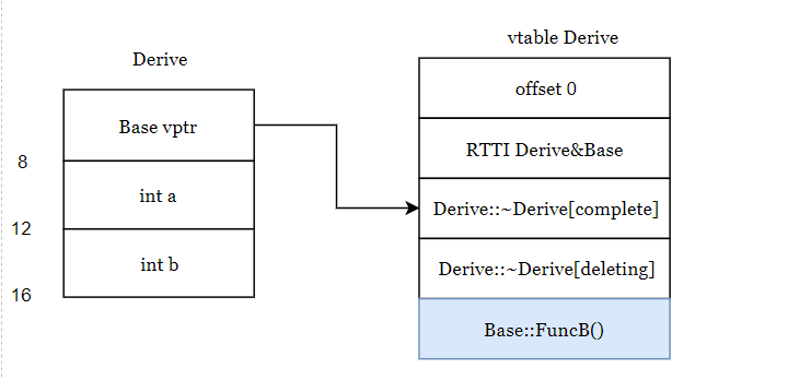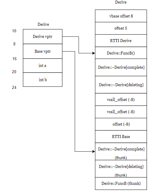 vcall_offset(-8):当虚基类Base的引用或指针base实际接受的是Derive类型的对象,执行base->FuncB()时候,由于FuncB()已经被重写,而此时的this指针指向的是Base类型的对象,需要对this指针进行调整,就是vcall_offset(-8),所以this指针向上调整了8字节,之后调用FuncB(),就调用到了被重写后的FuncB()函数。