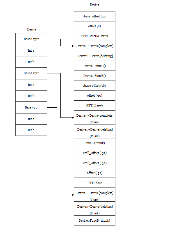 vcall_offset(-32):当虚基类Base的引用或指针base实际接受的是Derive类型的对象,执行base->FuncB()时候,由于FuncB()已经被重写,而此时的this指针指向的是Base类型的对象,需要对this指针进行调整,就是vcall_offset(-32),所以this指针向上调整了32字节,之后调用FuncB(),就调用到了被重写后的FuncB()函数。