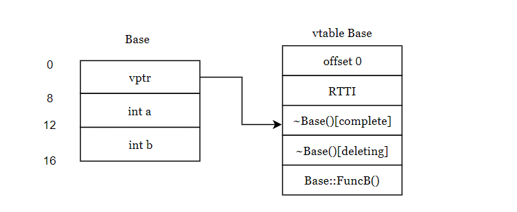 这个含有虚函数的结构体大小为16,在对象的头部,前8个字节是虚函数表的指针,指向虚函数的相应函数指针地址,a占4个字节,b占4个字节,总大小为16。