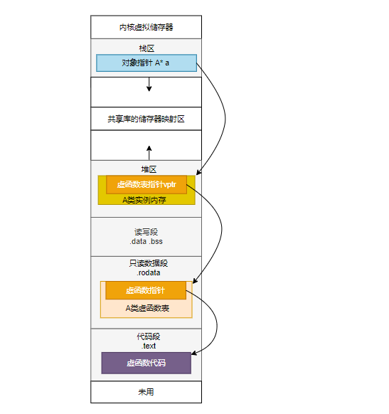 a作为对象指针存储在栈中,指向在堆中的类A的实例内存,其中实例内存布局中有虚函数表指针,指针指向的虚函数表存放在数据段中,虚函数表中的各个函数指针指向的函数 在代码段中。