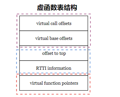 虚表结构大体如上图,正常的虚表结构中都含有后三项,当有虚继承情况下会有前两个表项。