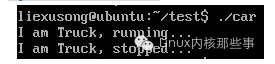 从上面定义可以知道,实现了run()和stop()方法的模块都可以被称为Car(汽车)。现在我们来编写两个模块,分别是Truck和Van。 Truck模块如下(truck.c):