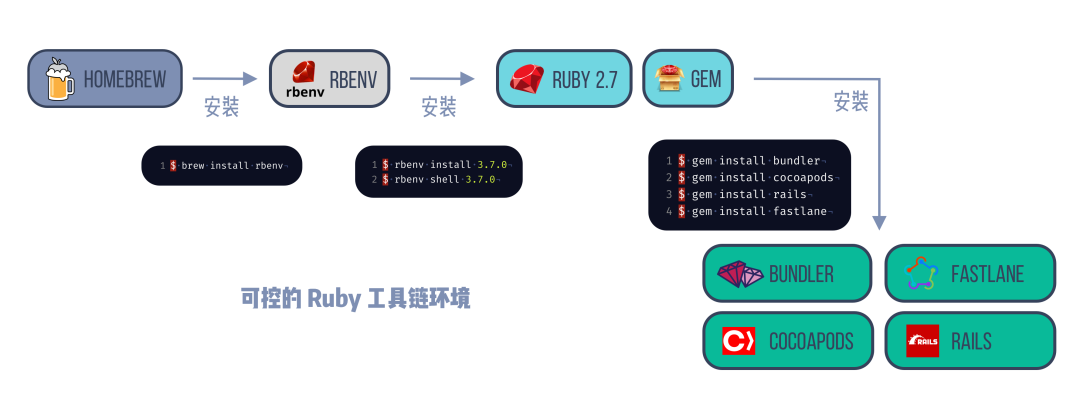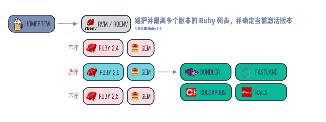 讲完了这些工具的分工,然后来说说实际的运用。我们可以使用 homebrew + rbenv + RubyGems + Bundler这一整套工具链来控制一个工程中 Ruby 工具的版本依赖。