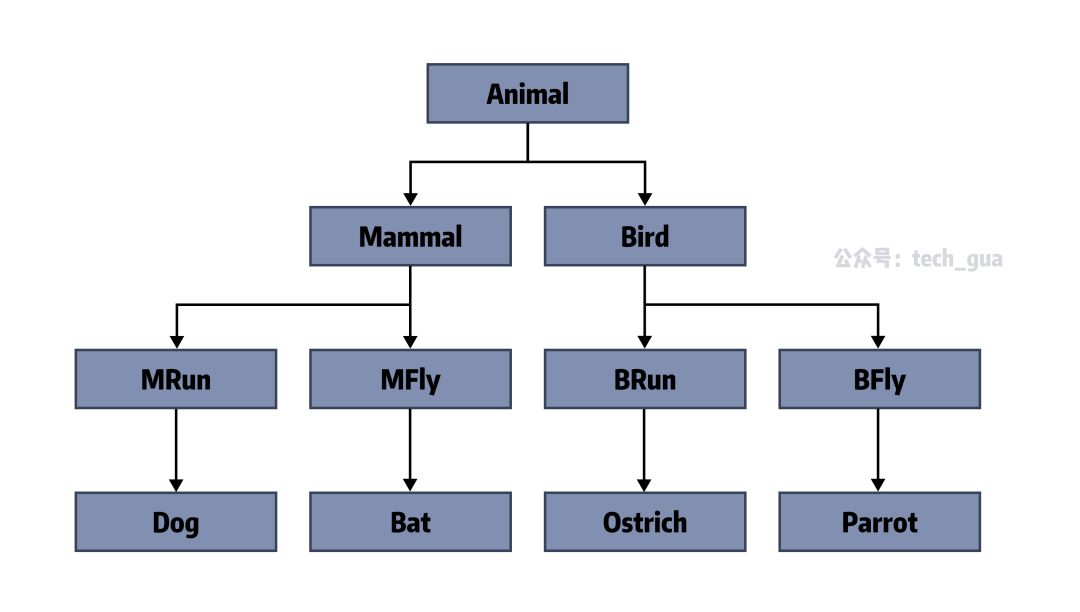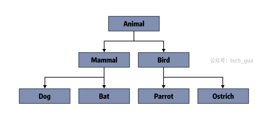 首先,我们可以按照哺乳动物和鸟类动物来进行继承关系的描述。由于 Python 支持多继承语法,所以我们下面用 Python 来描述一下使用多继承来描述上述场景: