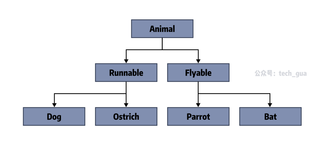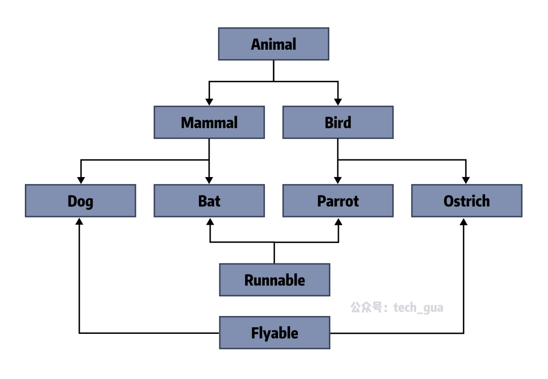 现在,我们给动物加上加上 Runnable 和 Flyable 的功能,当我们定义好这两个描述能力的类,使用多继承来描述每个动物即可: