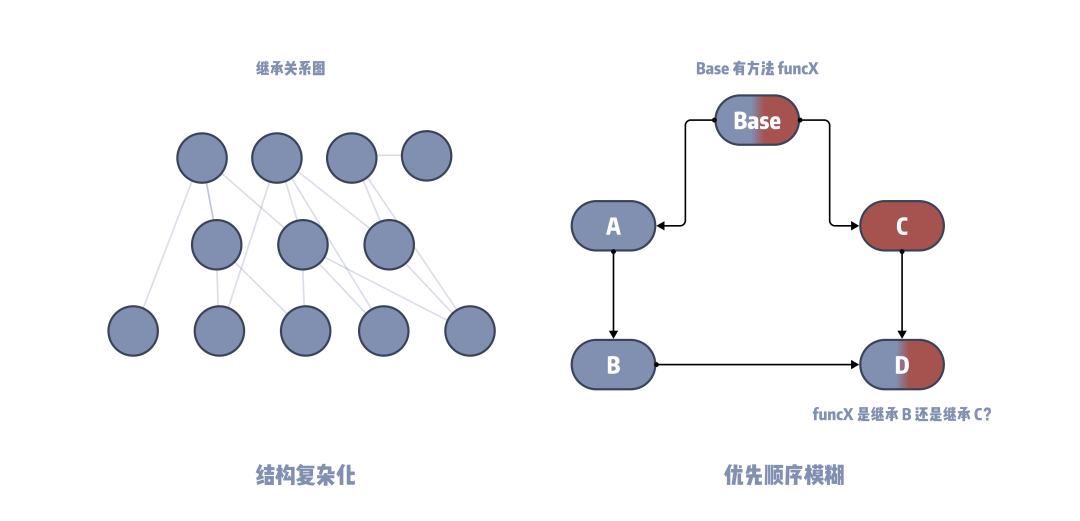 优先顺序模糊 - 假如有 A、C 同时继承了基类,B 继承了 A,然后 D 又同时继承了 B 和 C,所以此时 D 继承父类方法的顺序应该是 D ⇒ B ⇒ A ⇒ C 还是 D ⇒ B ⇒ C ⇒ A?又或者是其他顺序?如此优先顺序十分模糊。