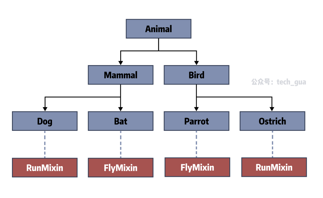 那么如果我们将 Mammal 哺乳动物和 Bird 鸟类动物封装成 Mix-in ,并将 Fly 和 Run 做成一级 class这样可以吗?在实现上是可以的,但是并不推荐。