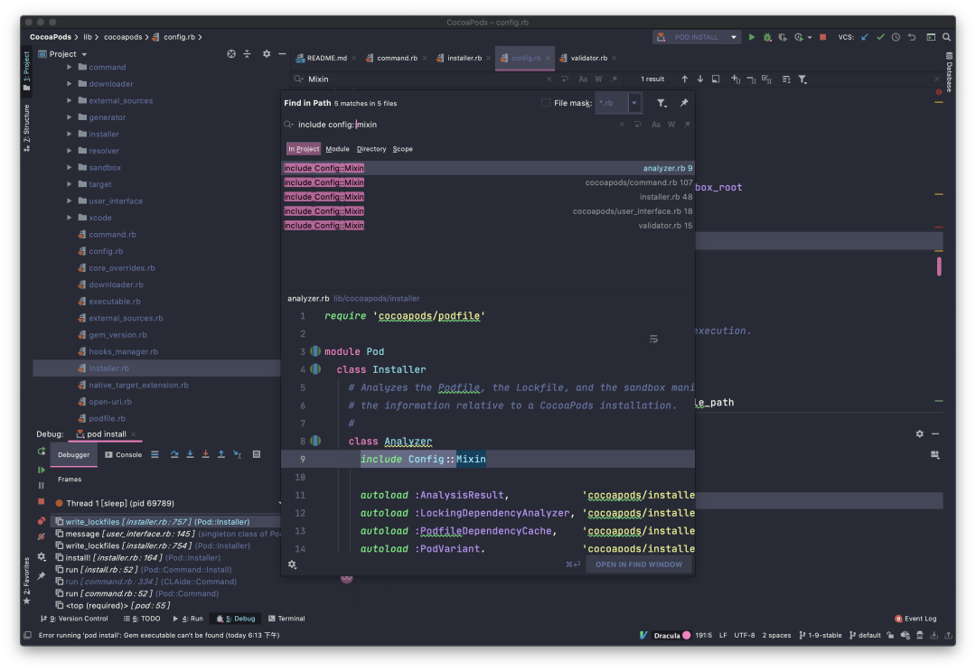 我们可以看到 Installer 拿入了 Config::Mixin 这个 module。而这个 config 属性其实就是CocoaPods 中的一些全局配置变量和一些配置字段。