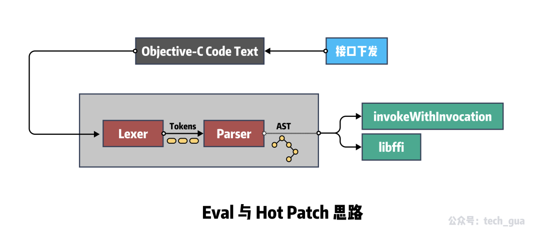 我们都知道 Objective-C 的 Runtime 利用消息转发可以动态执行任何 Objective-C 方法,这也就给了我们一个启示。假如我们自制一个轻量级解释器,动态解释 Objective-C 代码,利用 Runtime 消息转发来动态执行Objective-C 方法,就可以实现一个“准 eval 方法”。