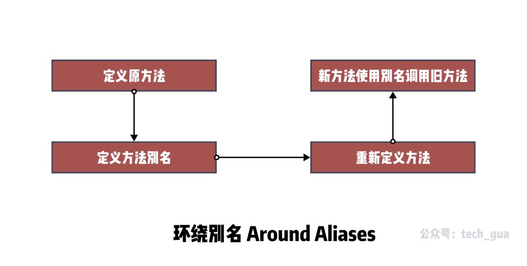 其实环绕别名只是一种特殊的写法,这里使用了 Ruby 的 alias 关键字以及上文提到的 Open Class 的特性。
