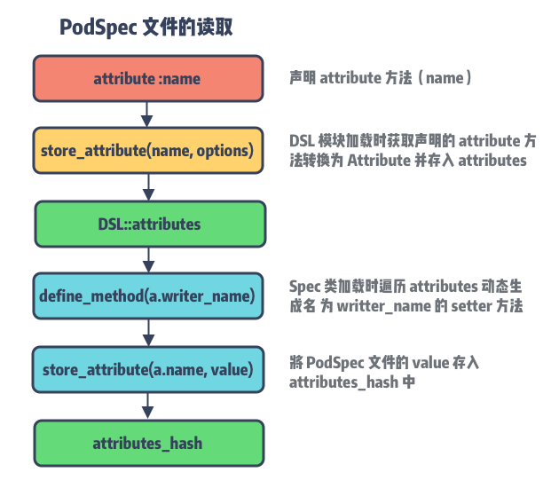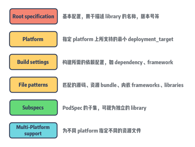 Spec中定义的attributes_hash; - 子模块可以指定自己的源代码、资源文件、编译配置、依赖等;