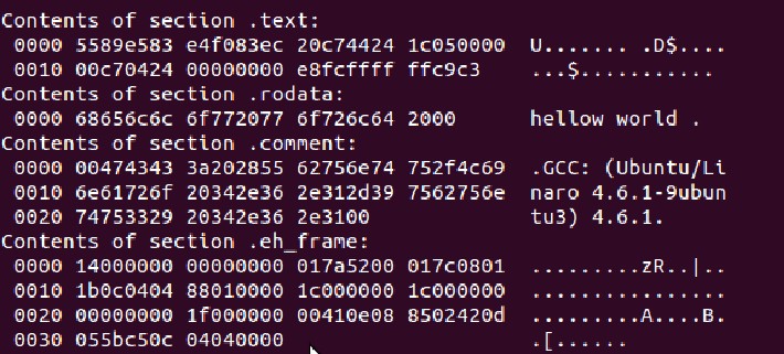 比较明显的如"rodata"只读数据段中就有 "hello world"。。汗,好像程序里的"hello"打错了,后面多加了一个"w",截图麻烦,。原谅下哈。
