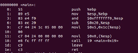 objdump -d a.out可以列出文件的汇编形式。不过这里只列出了主要部分,即main函数部分,其实在main函数执行的开始和main函数执行以后都还有多工作要做。