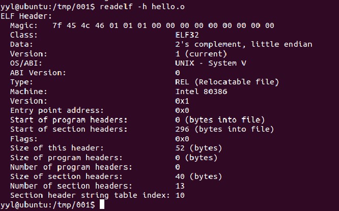 可以用readelf -h 来查看。(下图中查看的是 hello.o,它是源文件hello.c编译但未链接的文件。 这个和查看a.out 大部分是一样的)