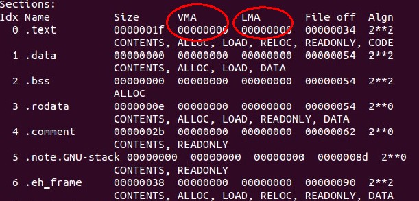 从左到右,第一列(Idx Name)是段的名字,第二列(Size)是大小 ,VMA为虚拟地址,LMA为物理地址,Fileoff是文件内的偏移。也就是这段相对于段中某一参考(一般是段起始)的距离。最后的Algn是对段属性的说明,暂时不用理会
