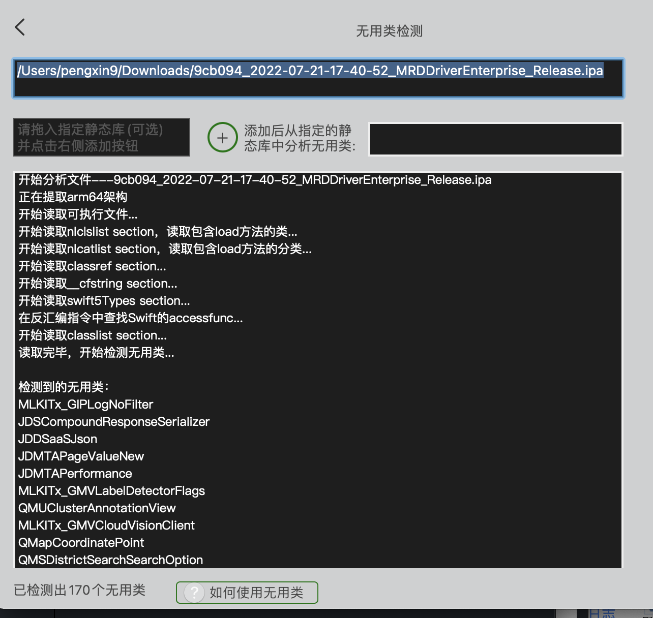 检测手段:静态扫描Mach-O文件对classlist和classrefs做差集,形成初步的无用类集合,并根据业务代码特征做二次适配