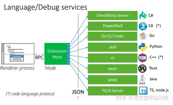 由于 VSC 采用多进程的架构,语言的开发者可以使用自己熟悉的语言编写这门语言的语言服务,VSC 将采用 JSON-RPC 通信的方式跟语言服务沟通,执行用户命令,获取结果。