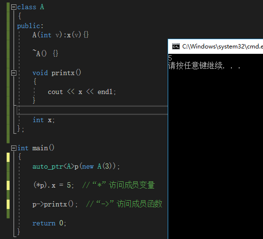 这里说了一个“让auto_ptr指向的地方”,显然,auto_ptr只是一个类/对象,它的“指向”都是通过其成员指针变量指针_Myptr实现的,按道理来说auto_ptr不应该有“指向”的说法,但是auto_ptr又却是被称为智能指针,这就是因为作为类/对象的auto_ptr确实能有指针一样的行为。