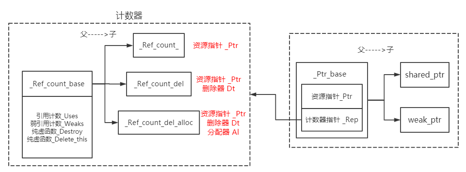 Ref_count_del_alloc是_Ref_count_base的派生类,定义了资源释放函数_Destroy() 、删除计数器自身函数_Delete_this(),以及一个指向_Ty类型的指针_Ptr、_Dx类型的删除器_Dtor、_Myalty类型的分配器_Myal,由派生类_Ref_count生成对象时只能通过指针_Ptr、删除器_Dtor和分配器_Myal来进行构造。