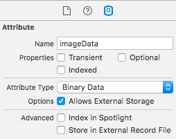 在上一节中,使用了 NSData 来存储图像的二进制数据,这里也可以不用 transient attribute 这种方式,直接用 NSData 存储。如果直接使用二进制来存储数据,那么有几个问题需要考虑。