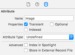 - 以上这些标准类型都是不可变的类型,剩下的两种:Undefined 和 Transformable 用于支持非标准类型的数据。对于 Undefined 类型,记得在右侧的 Data Model Inspector 里勾选 Transient 选项。支持非标准类型时,你最好也使用不可变类型,不然 Core Data 无法跟踪数据的变化。也就是说每次给属性设置一个新的值,Core Data 才知道你的