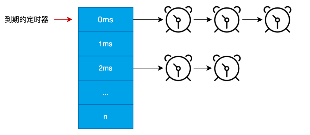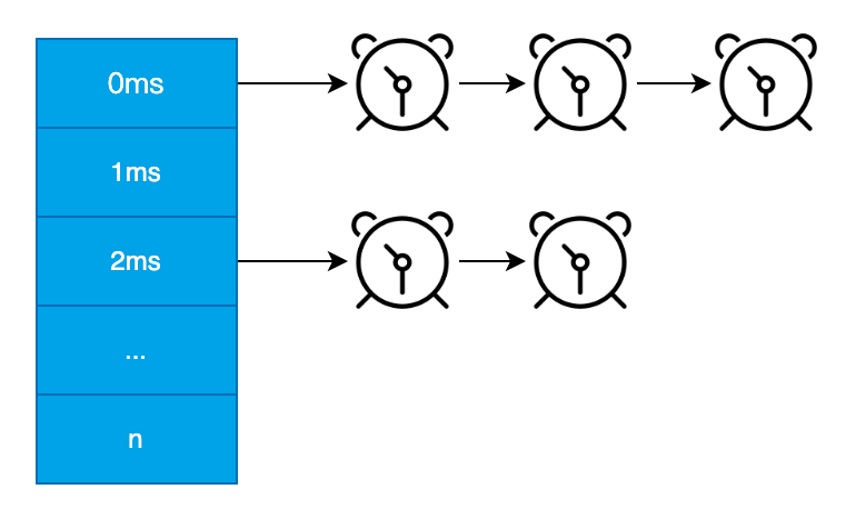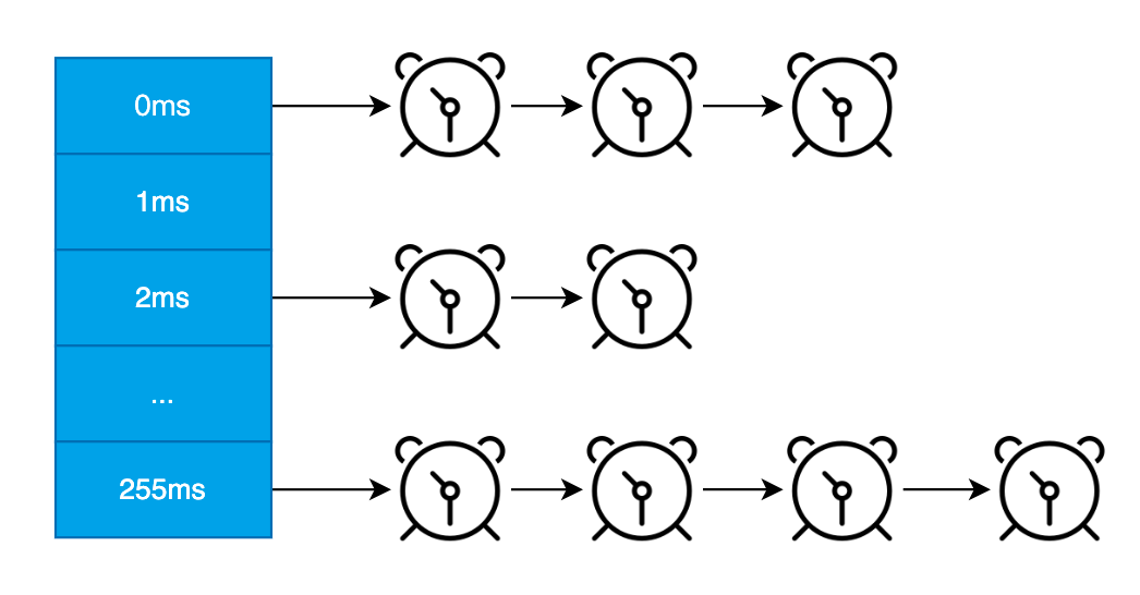 如上图所示的数组中,索引为 1 的槽位存放的是 1 毫秒后超时的定时器列表,索引为 2 的槽位存放的是 2 毫秒后超时的定时器列表,如此类推...