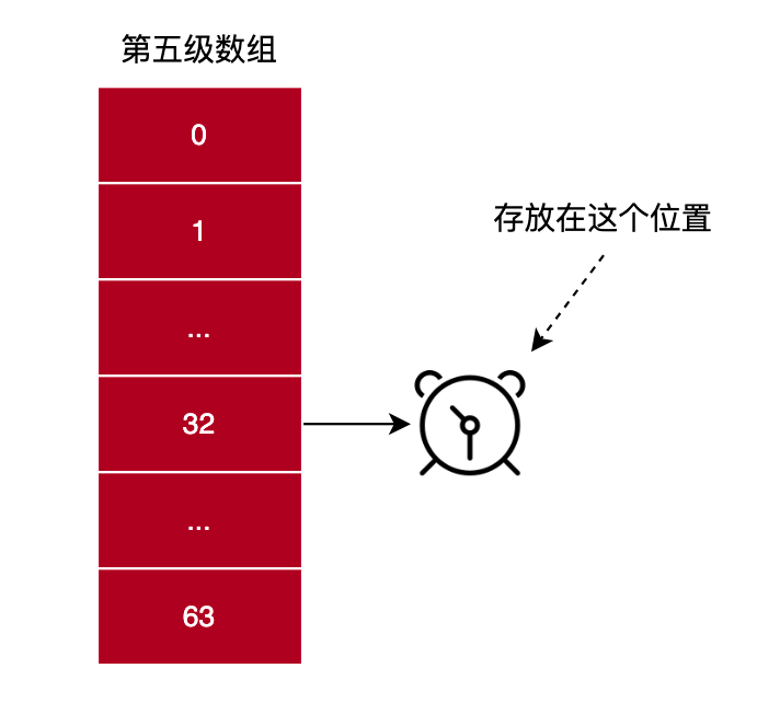 例如,一个定时器的超时时间其第五级的值为 32,那么此定时器将会被存放到第五级数组的第 32 个槽位上。如下图所示: