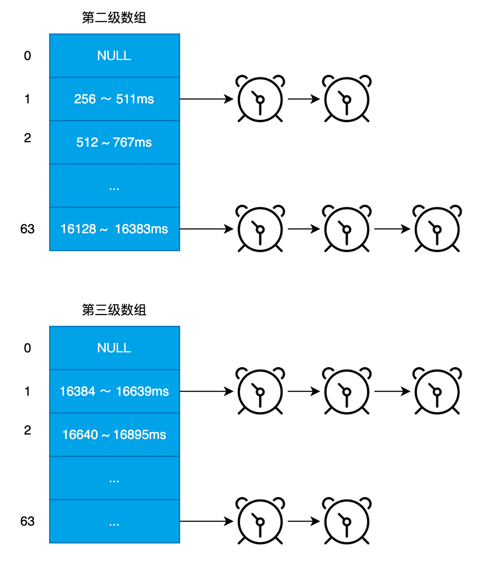 [256, 16384)毫秒的定时器(16384 = 256 * 64)。 - 第三级数组存放的是超时时间范围为