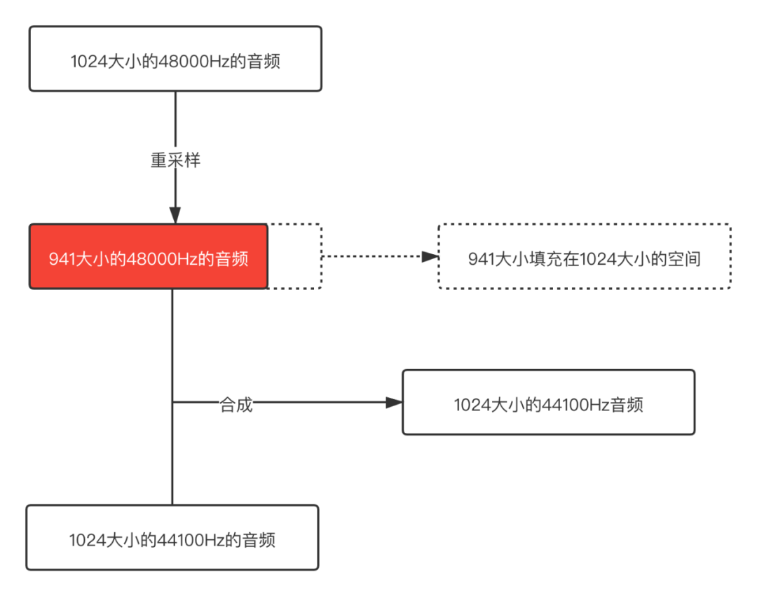 从这个示意图可以很明显的看出问题,48000 Hz重采样之后的音频buffer size已经变小了,但是用这个buffer和44100 Hz正常的buffer合并,那其中一个音频后面就是一段空数据,所以合成之后肯定会出现杂音的。