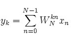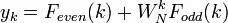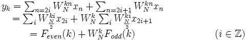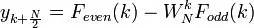 奇数号和偶数号序列N/2点变换。由此式只能计算出yk的前N/2个点,对于后N/2个点,注意Fodd(k) 和 Feven(k) 都是周期为N/2的函数,由单位根的对称性,于是有以下变换公式:
