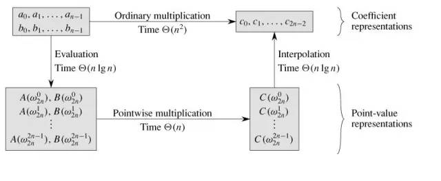稍后,你将看到,如果巧妙的选取xk的话,适当的利用点值表示可以使多项式的乘法可以在线性时间内完成。所以,如果我们能恰到好处的利用系数表示法与点值表示法的相互