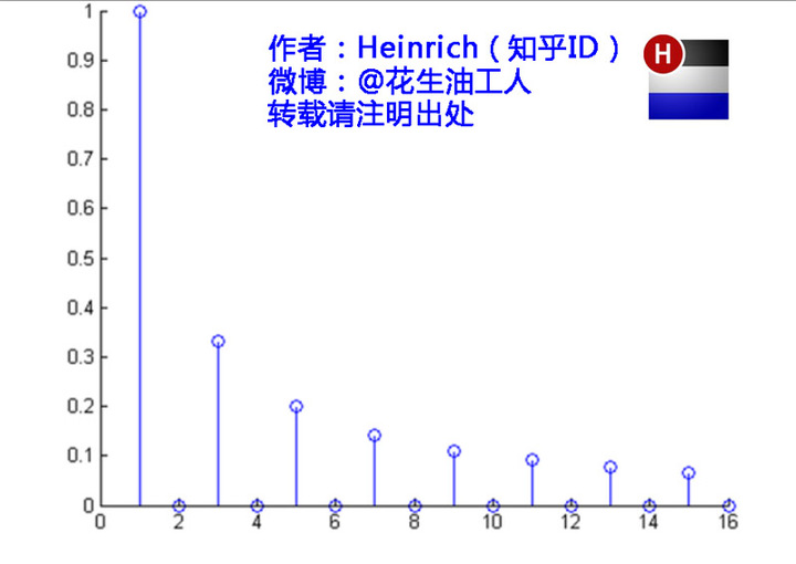 注意到,相位谱中的相位除了0,就是Pi。因为cos(t+Pi)=-cos(t),所以实际上相位为Pi的波只是上下翻转了而已。对于周期方波的傅里叶级数,这样的相位谱已经是很简单的了。另外值得注意的是,由于cos(t+2Pi)=cos(t),所以相位差是周期的,pi和3pi,5pi,7pi都是相同的相位。人为定义相位谱的值域为(-pi,pi],所以图中的相位差均为Pi。