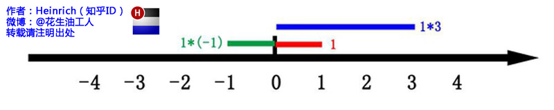 这里有一条数轴,在数轴上有一个红色的线段,它的长度是1。当它乘以3的时候,它的长度发生了变化,变成了蓝色的线段,而当它乘以-1的时候,就变成了绿色的线段,或者说线段在数轴上围绕原点旋转了180度。