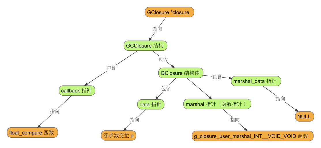 由于 compare 函数的第一个参数是闭包 closure,它已经包含了浮点数变量 a 和回调函数 float_compare。当我们将 closure 作为 g_closure_invoke 函数的参数时,后者会基于 closure 中的 marshal 指针调用 g_closure_user_marshal_INT__VOID_VOID 函数,而 g_closure_user_marshal_INT__VOID_VOID 函数是我们自己定义的,对于本文示例而言其主干部分如下: