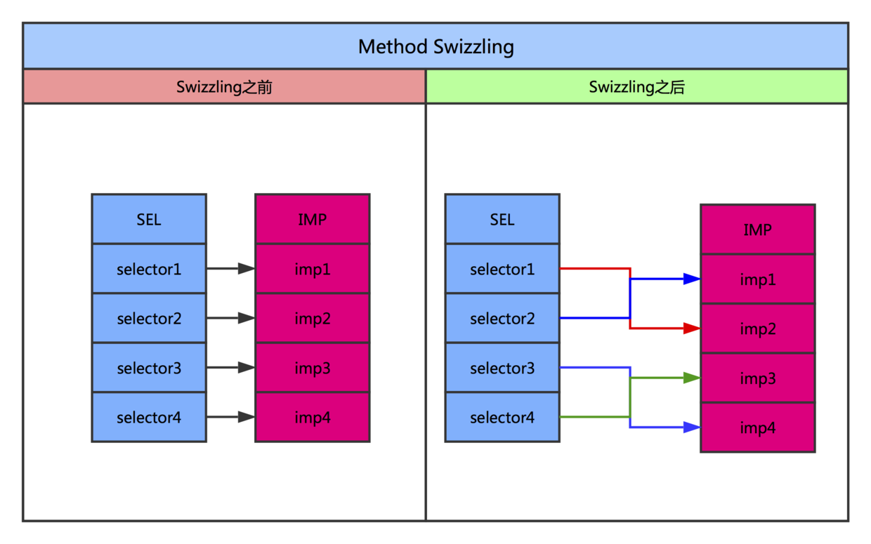 Method swizzling 是利用 Objective-C Runtime 特性把一个方法的实现与另一个方法的实现进行替换的技术。每个 Class 结构体中都有一个 Dispatch Table 的成员变量,Dispatch Table 中建立了每个 SEL(方法名)和对应的 IMP(方法实现,指向 C 函数的指针)的映射关系,Method Swizzling 就是将原有的 SEL 和 IMP映射关系打破,并建立新的关联来达到方法替换的目的。