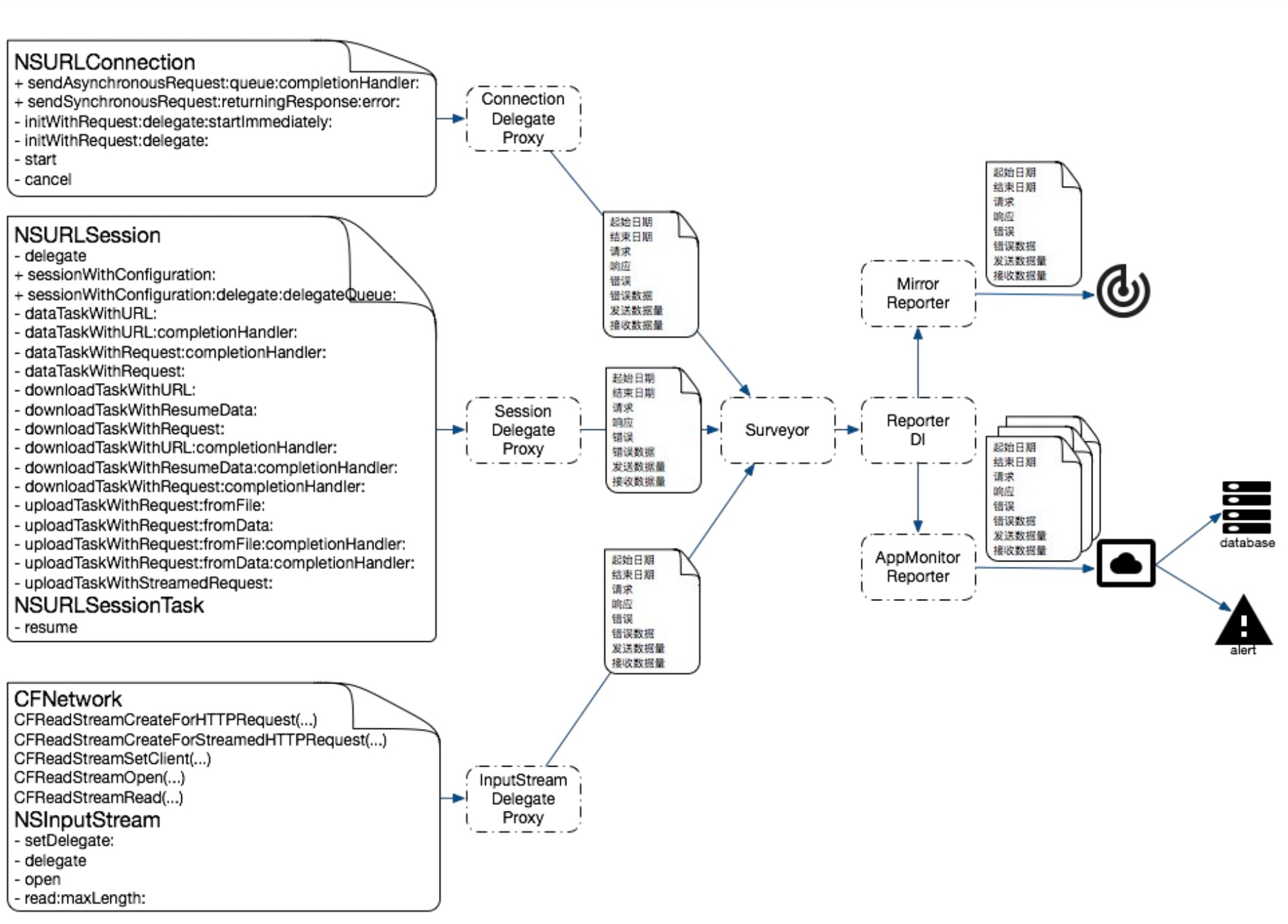 使用上述方式的缺点就是无法做到选择性的监控和 HTTP 相关的 CFReadStream,而不涉及来自文件和内存的 CFReadStream,NeteaseAPM 的解决方案是在系统构造 HTTP Stream 时,将一个 NSInputStream 的子类 ProxyStream 桥接为 CFReadStream 返回给用户,来达到单独监控 HTTP Stream 的目的。