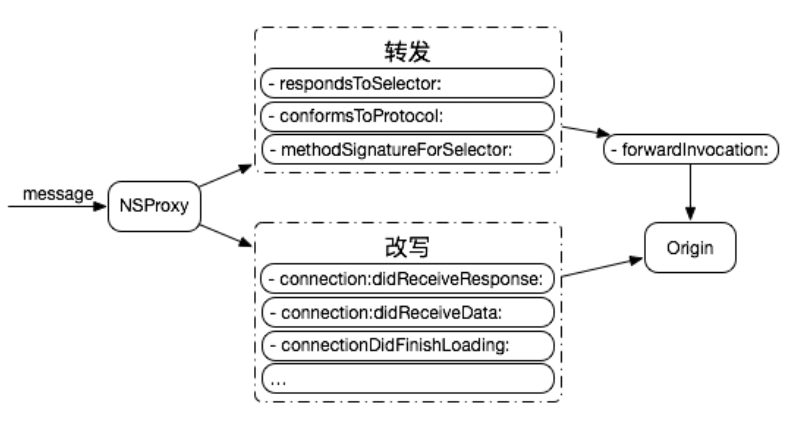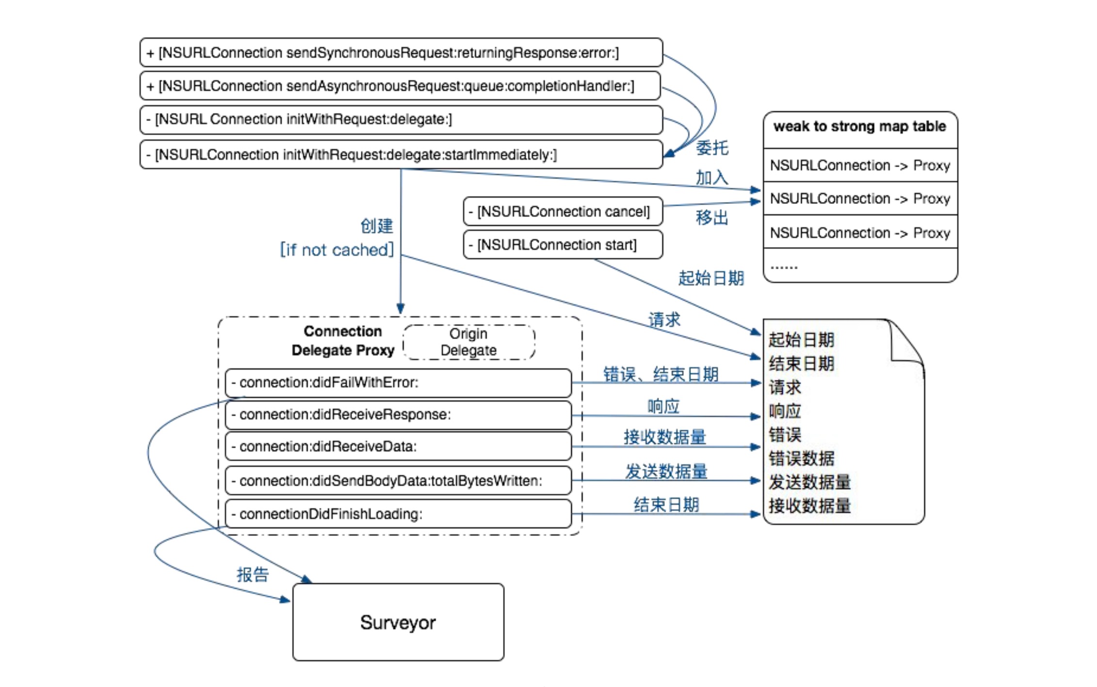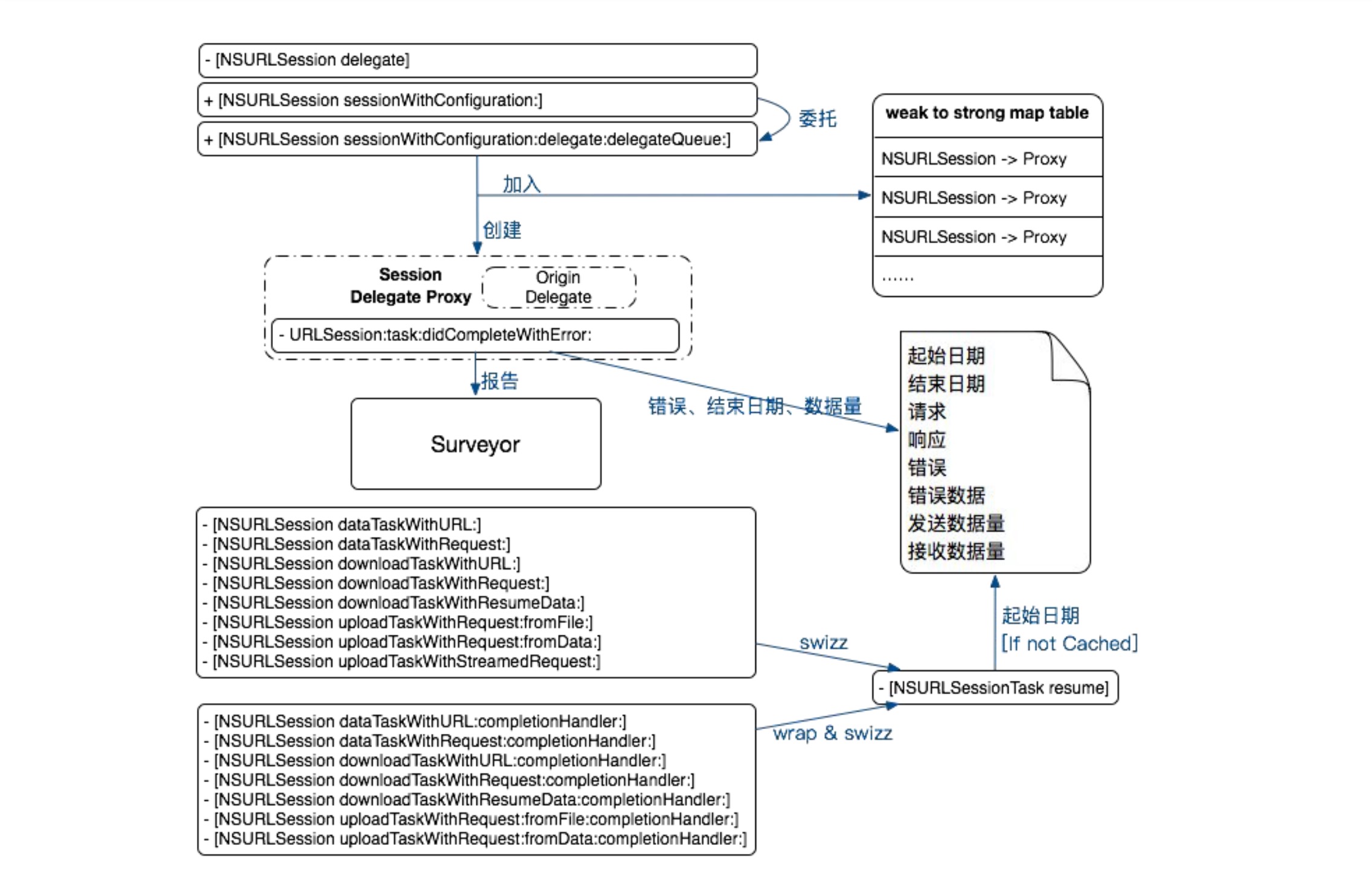 Method swizzling 替换方法需要指定类名,但是 NSURLConnectionDelegate 和 NSURLSessionDelegate 是由业务方指定,通常来说是不确定,所以这种场景不适合使用 Method swizzling。使用 NSProxy 可以解决上面的问题,具体实现:proxy delegate 替换 NSURLConnection 和 NSURLSession 原来的 delegate,当 proxy delegate 收到回调时,如果是要 hook 的方法,则调用 proxy 的实现,proxy 的实现最后会调用原来的 delegate;如果不是要 hook 的方法,则通过消息转发机制将消息转发给原来的 delegate。下图示意了整个操作流程。