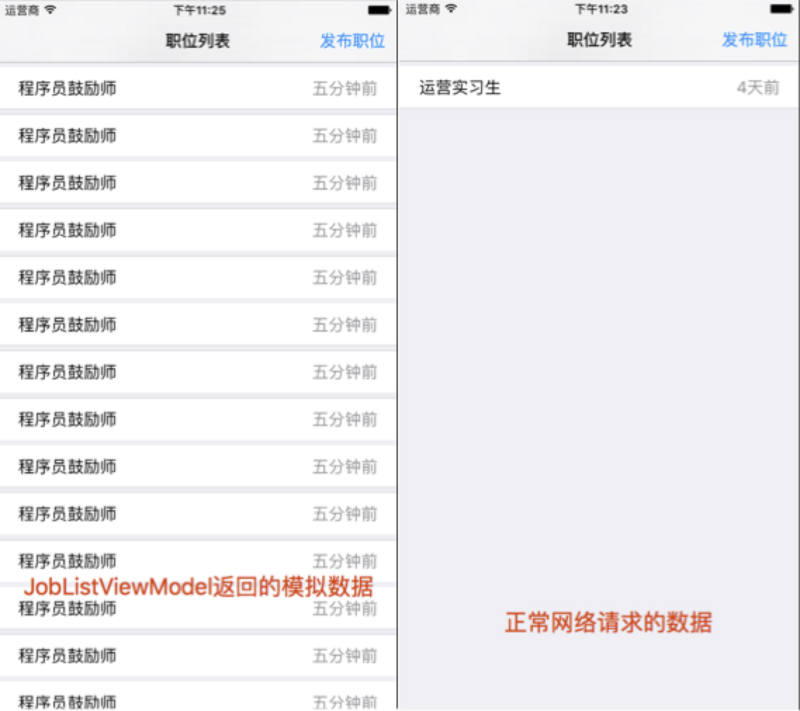 测试数据输入给JobViewController,如上在后台接口还没有就绪的时候,可以通过