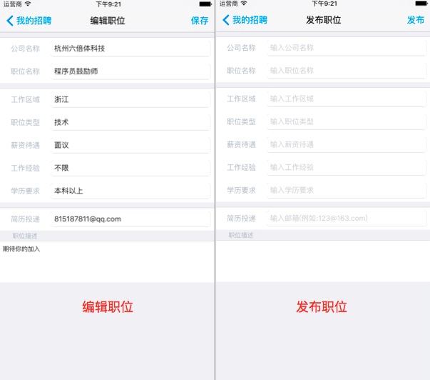 更新或添加的网络操作,何不一开始就操作它的属性呢?点击职位列表的Cell进入职位编辑界面会将jobId传入JobViewController,发布则
