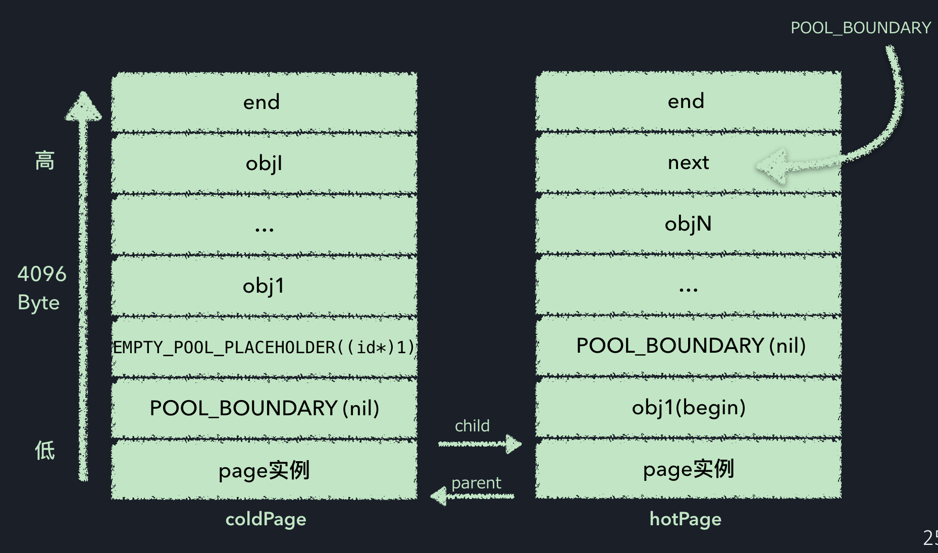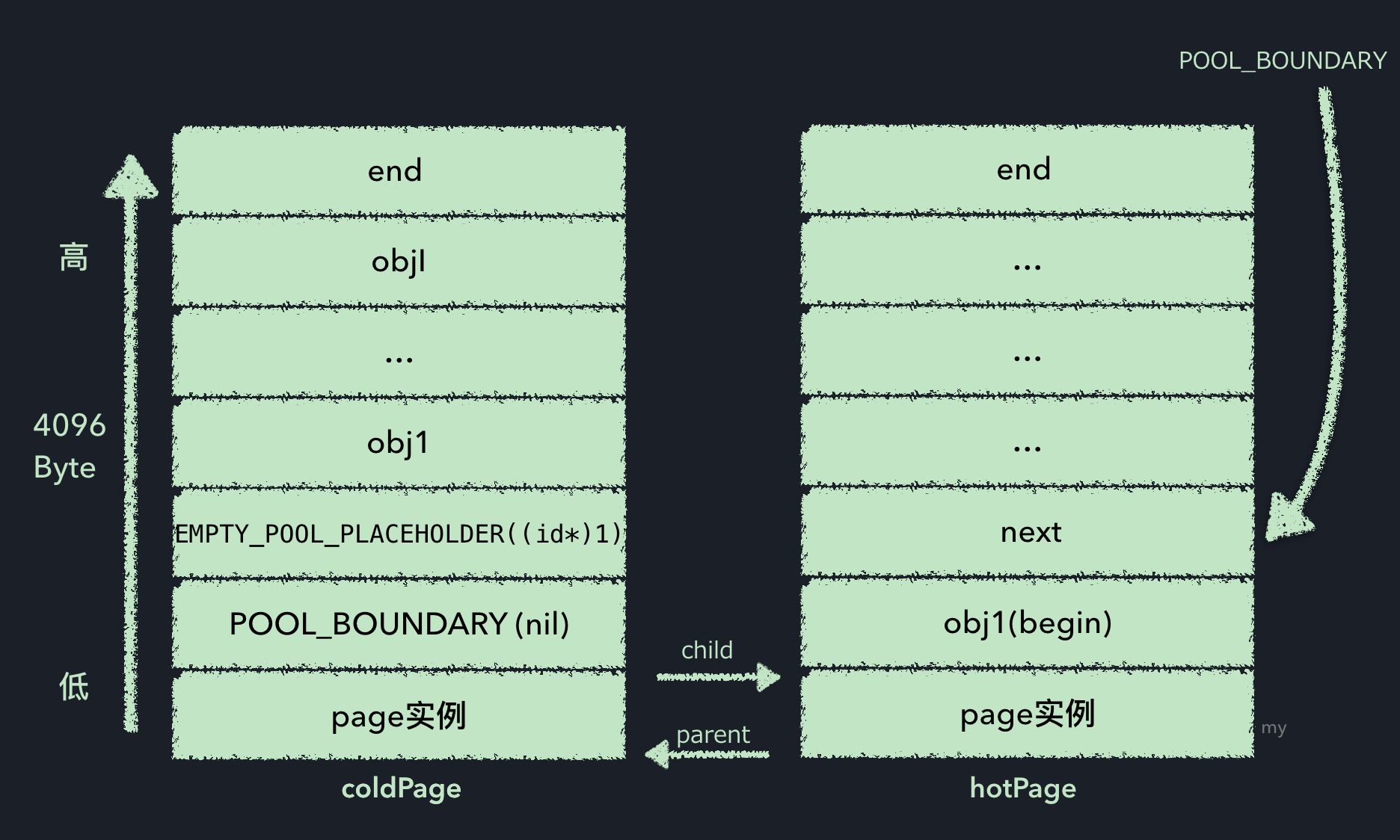 收到pop命令后,首先会根据push操作返回的POOL_BOUNDARY哨兵对象的地址获取到当前page,然后在当前page中,将晚于哨兵对象添