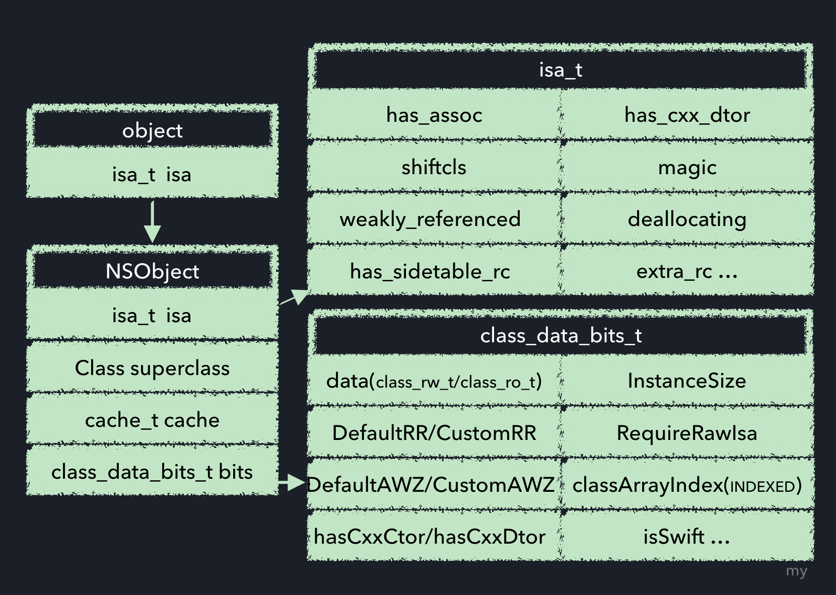 Class superclass- 指向父类;cache_t cache- 方法缓存,具体可参考这篇文章:深入理解Objective-C:方法缓存;class_data_bits_t bits- 存储类方法,属性,遵从协议等数据.