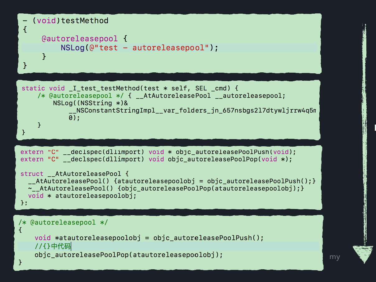 runloop后自动生成NSAutoreleasePool接受对象,当当前runloop迭代结束时,释放该pool. enumerateObjectUsingBlock:,系统在这类快速遍历方法中会自动添加autoreleasepool.