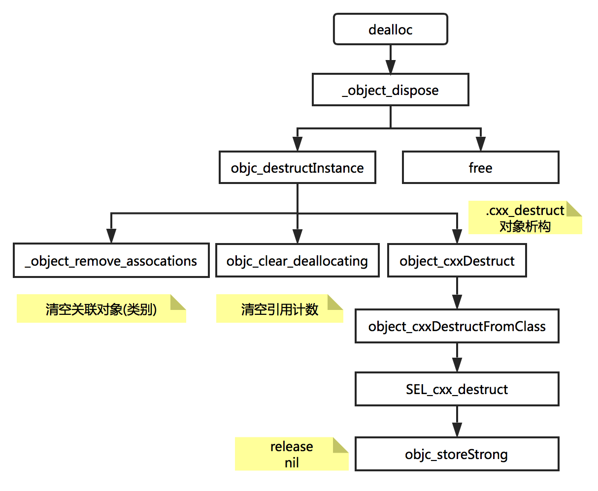 这里提到的析构方法SEL_cxx_destruct,和上文提到的构造方法SEL_cxx_construct相对应.在孙源的ARC下dealloc过