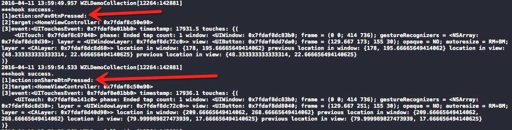 可以看到,通过category+method swizzling的方式在没有修改现有工程任何代码的情况下已经成功Hook到所有点击事件,在Hook代码中我们