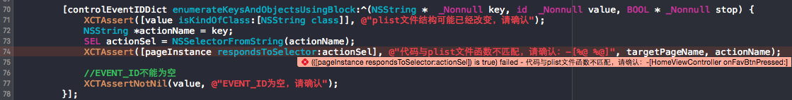 XCTAssert([pageInstance respondsToSelector:actionSel], @"代码与plist文件函数不匹配,请确认:-[%@ %@]", targetPageName, actionName);