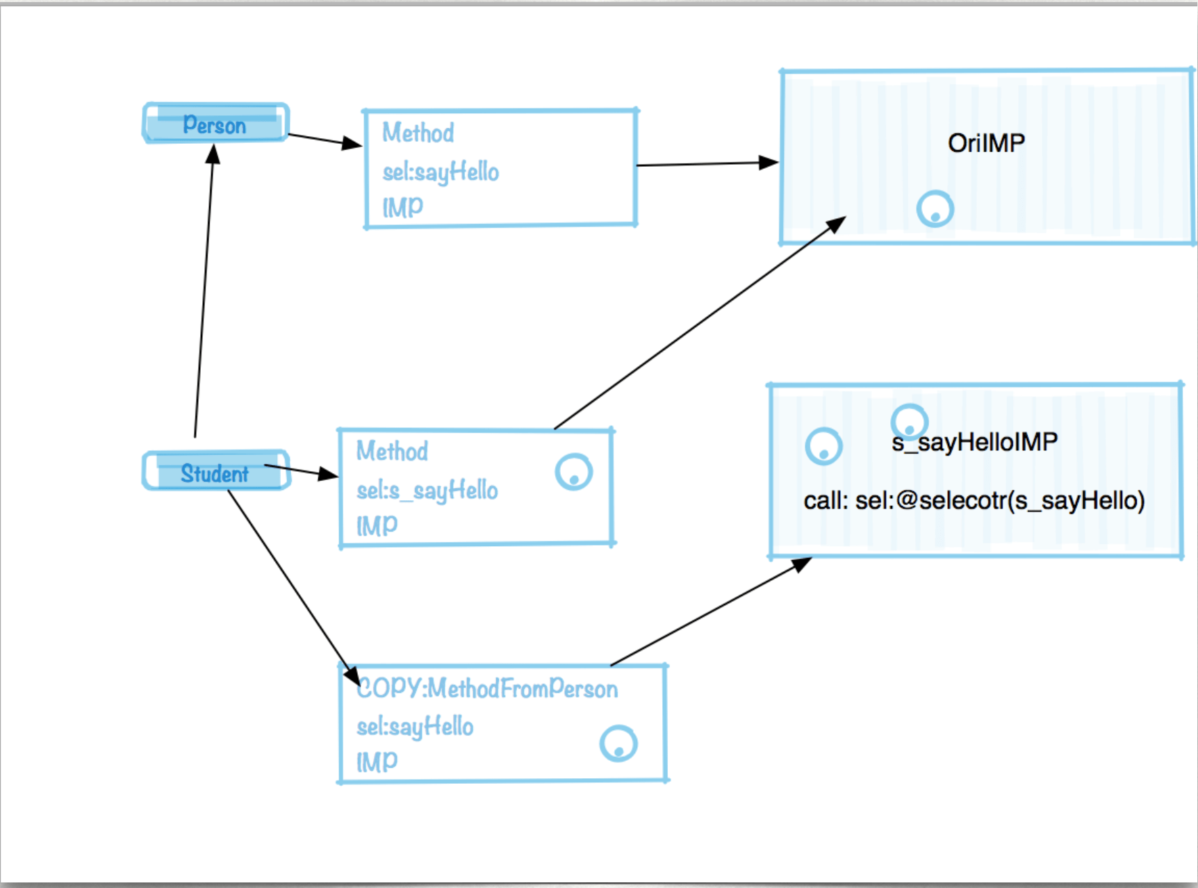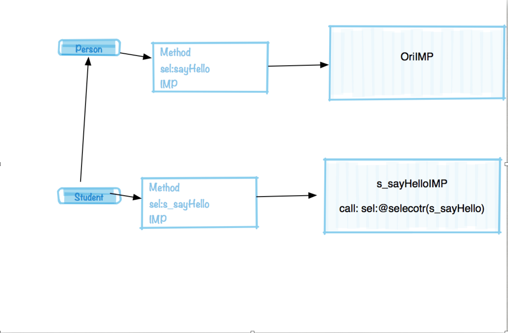 由于调用了 class_addMethod 方法会导致重新生成一份新的Method添加到 Student 类上面 但是 sel 并没有发生变化,IMP 还是指向父类唯一的那个 IMP。