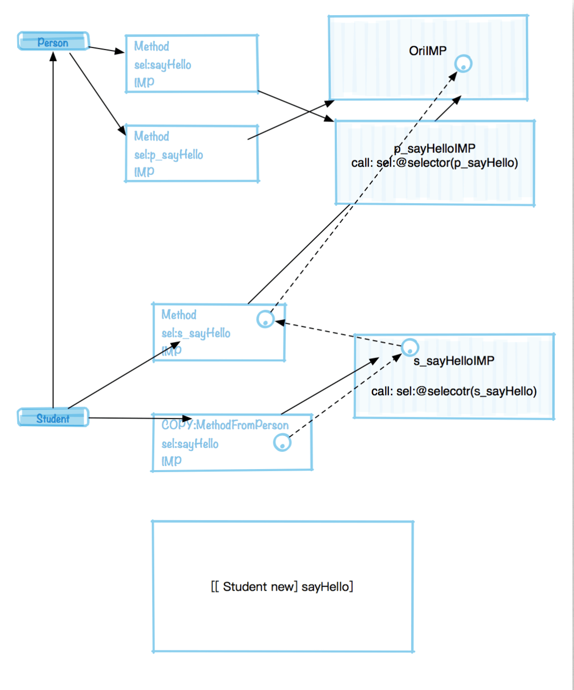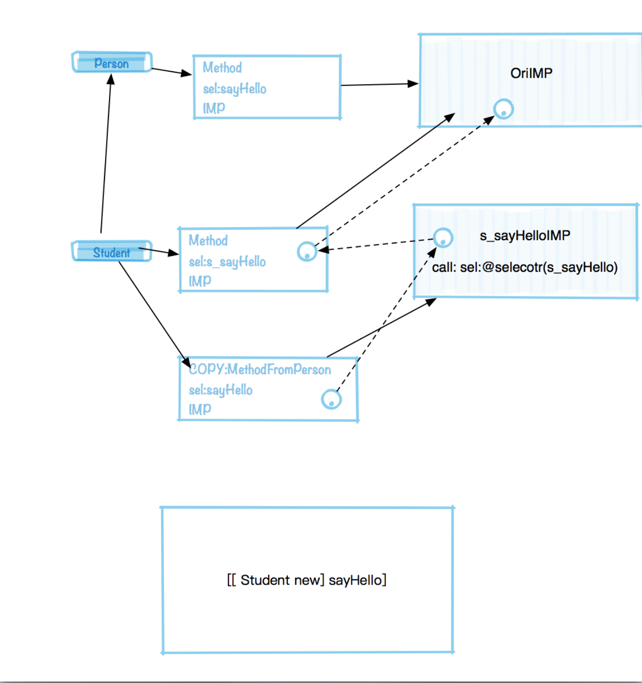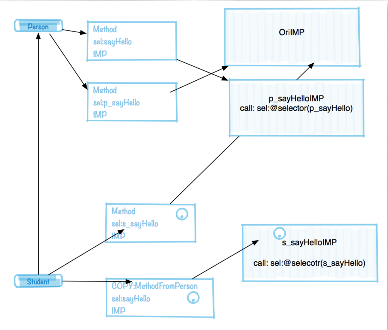 最开始的时候父类拥有自己的 sayHello 方法,子类拥有分类添加的 s_sayHello 方法并且在 s_sayHello 方法内部调用了 sel 为 s_sayHello 方法。