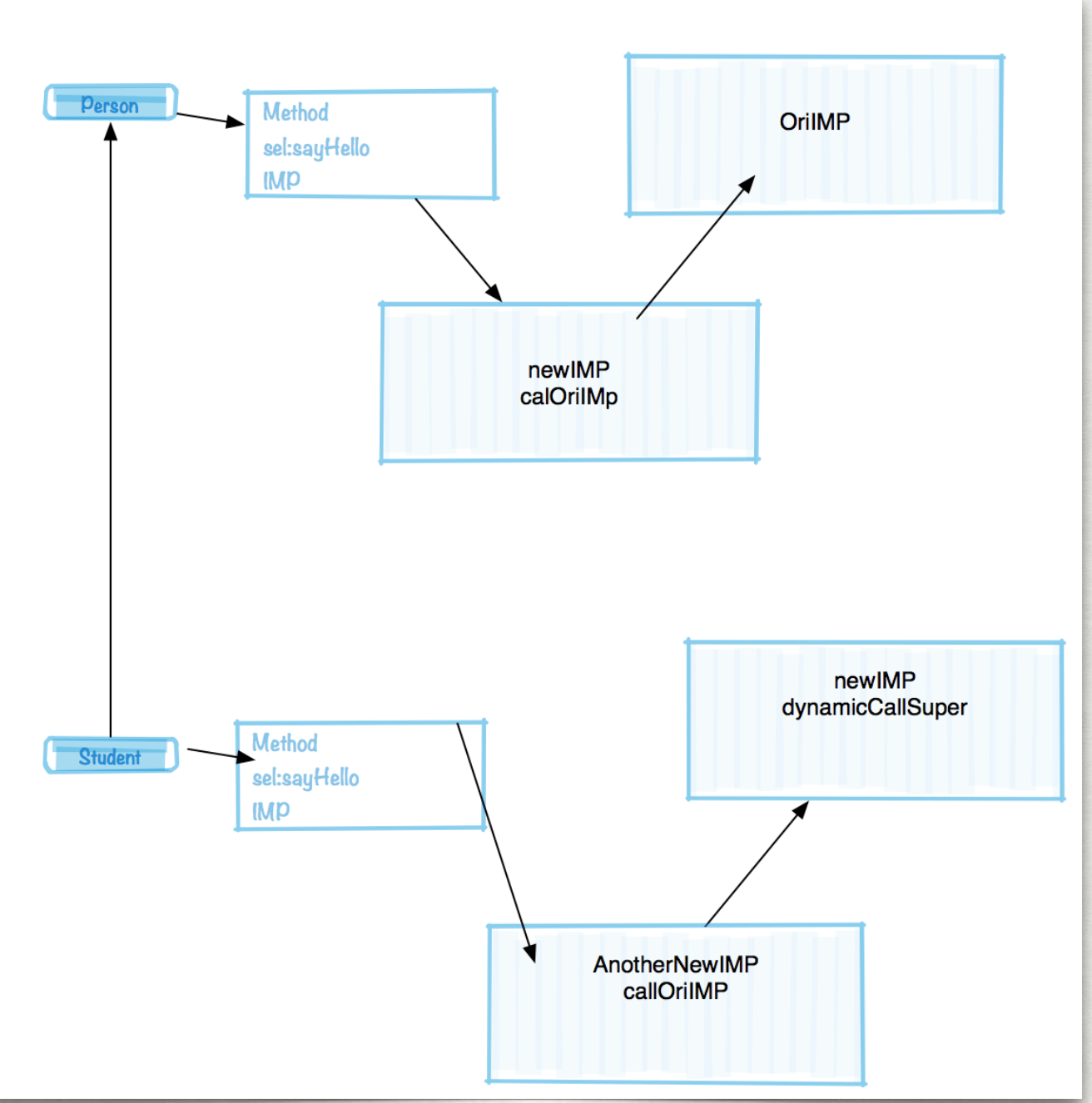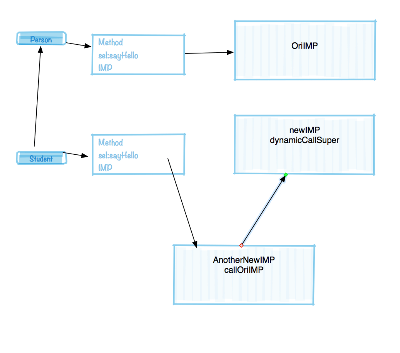 如果我们再次对 Student Hook,由于 Student 已经有 sayHello 方法,这次 replace 会返回原来 IMP 的指针, 然后新的 IMP 会执被填充到 Method 的指针指向。