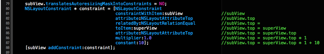 下方这段代码就是给subView添加了一个相对于superView的Top约束。一个View要想确定位置一个约束是不够的,所以可想而知,我们要写多个下方的这样的约束来确定一个View的相对位置。其实下方就是一个表达式,NSLayoutConstraint构造器中每个参数构成这个表达式的一个组成部分。由上到下我们队参数个个参数进行解析,参数constraintWithItem用来指定所约束的对象,在此就是subView。第一个attribute参数则指定约束该对象的那个属性,在此就是subView的Top属性。参数relatedBy用来指定约束关系,比如大于等于,小于等于或者等于某个约束值。参数toItem则指定的是约束相对的对象,在此是相对superView的,所以此处的参数是superView。第二个attribute参数就是指定superView的Top属性。multiplier指定相对约束的倍数关系,constant则是约束的偏移量。